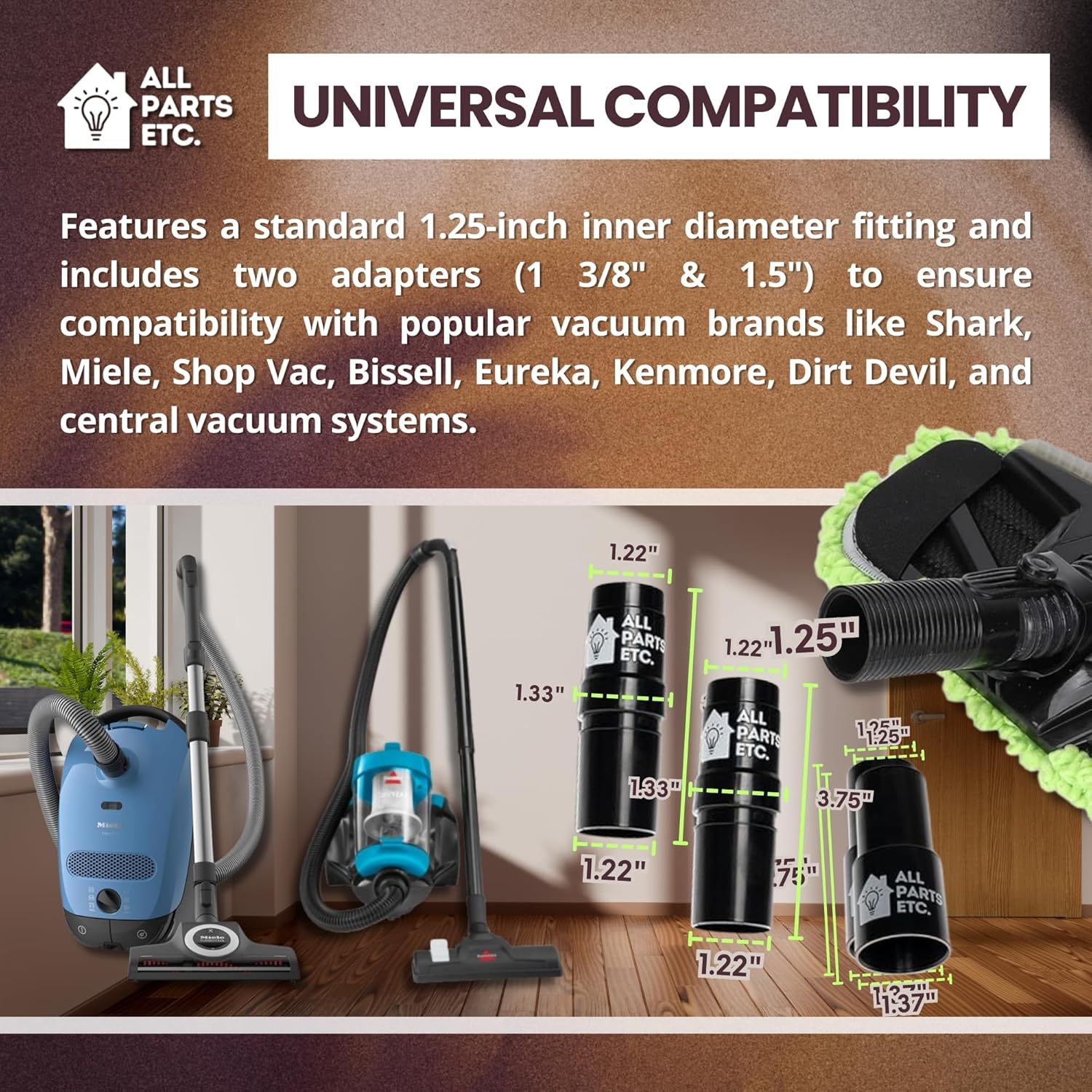 Universal Compatibility for Most Vacuums: Features a standard 1.25-inch inner diameter fitting and includes two adapters (1 3/8″ & 1.5″) to ensure compatibility with popular vacuum brands like Shark, Miele, Shop Vac, Bissell, Eureka, Kenmore, Dirt Devil, and central vacuum systems.