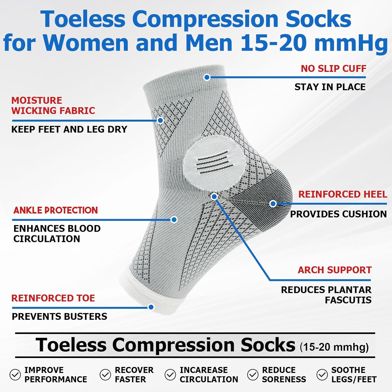 Wear It All Day Long: The neuropathy pain relief socks are designed for day or night use. Enjoy all-day comfort with our functional socks, meticulously crafted from comfy, breathable, and moisture-wicking fabric. Anti-slip cuffs keep the toeless compression socks in place, perfect for professionals who stay on their feet the whole day.