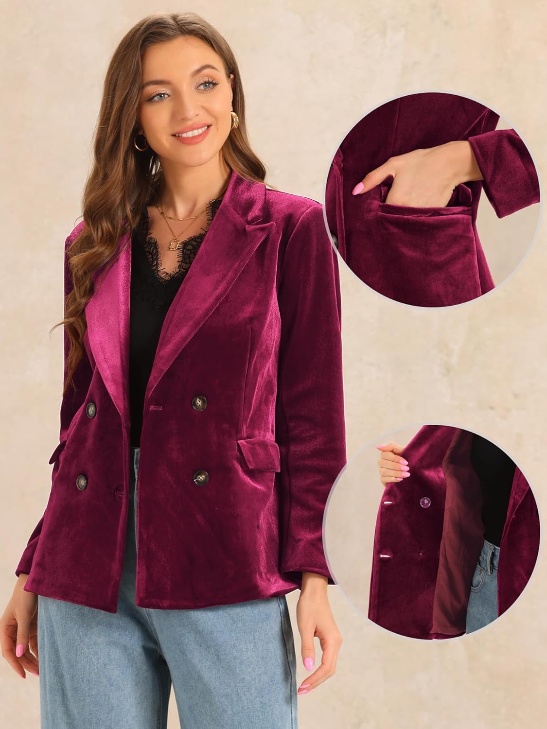 Allegra K Velvet Blazers for Women’s Notched Lapel Long Sleeve Double Breasted Blazer Jacket