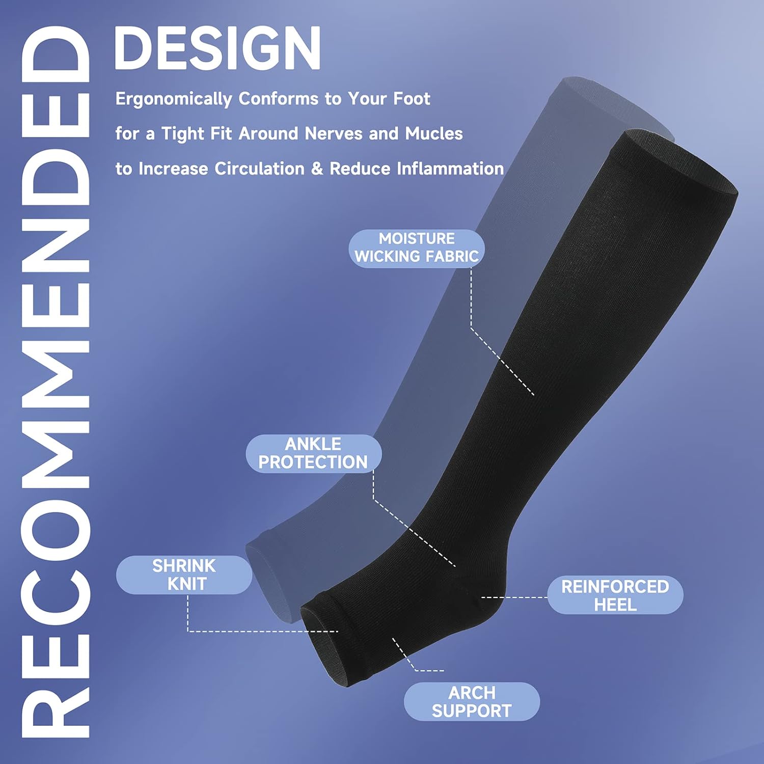 ✅ OPEN TOE COMPRESSION SOCKS FOR MEN AND WOMEN – Scientifically Proven that 15-20 mmHg Gradient Open Toe Compression Socks Can Compress the Ankle to the greatest extent and gradually reduce the pressure on the calf. Toeless compression socks can provide support for the legs, effectively promote blood circulation, and are not tight. After prolonged exercise, it helps to reduce the accumulation of lactic acid and helps to restore the muscles of the calves, ankles, feet and legs.