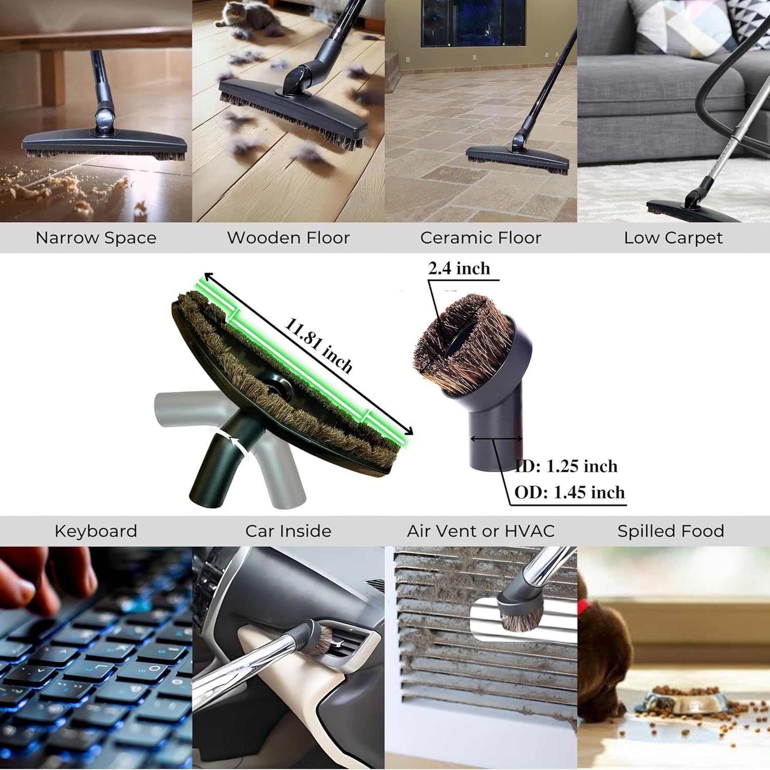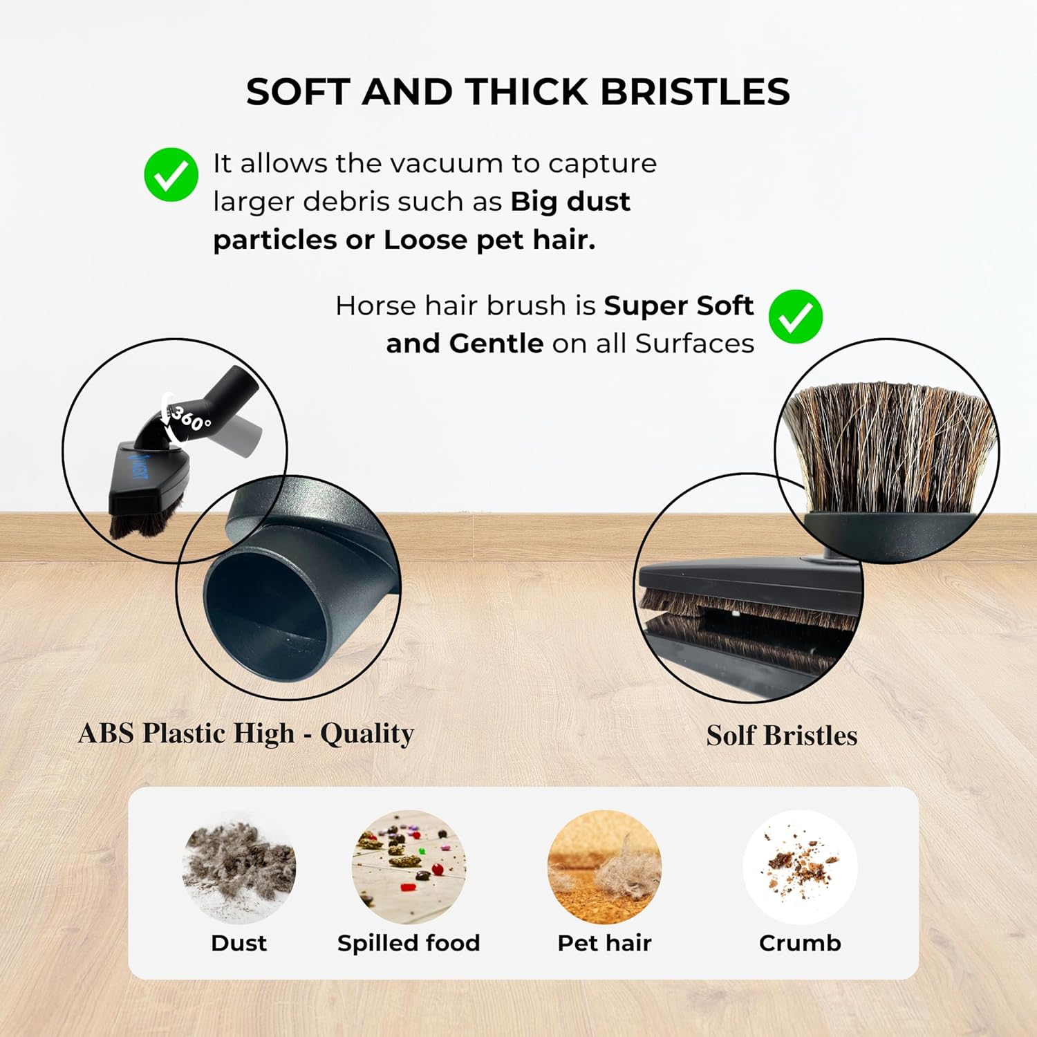 Horehair Vacuum Floor Attachment: The horsehair bristles are soft and gentle on the surfaces, so it is safe to use on any surface without worrying about scratches. The ability to rotate the brush and reach small spaces has been very helpful in getting your floors thoroughly clean. This tool will make cleaning your wood floors a much easier and more effective task.Give it a try today!