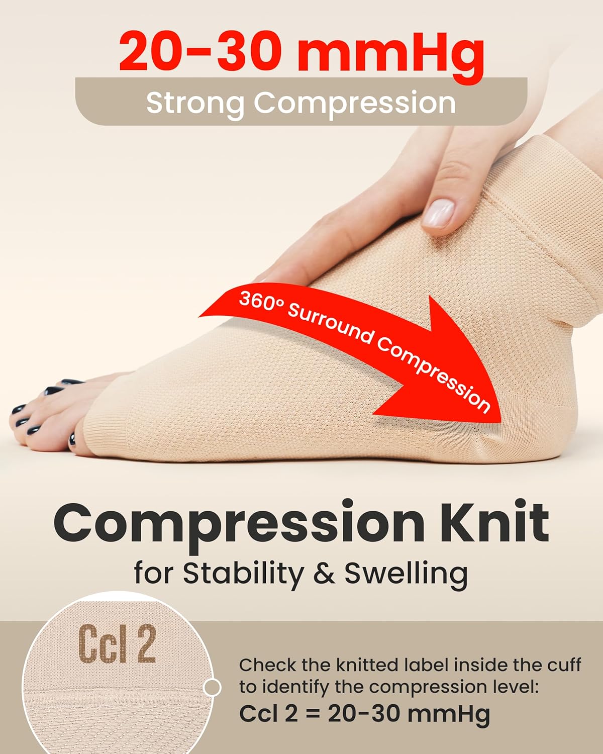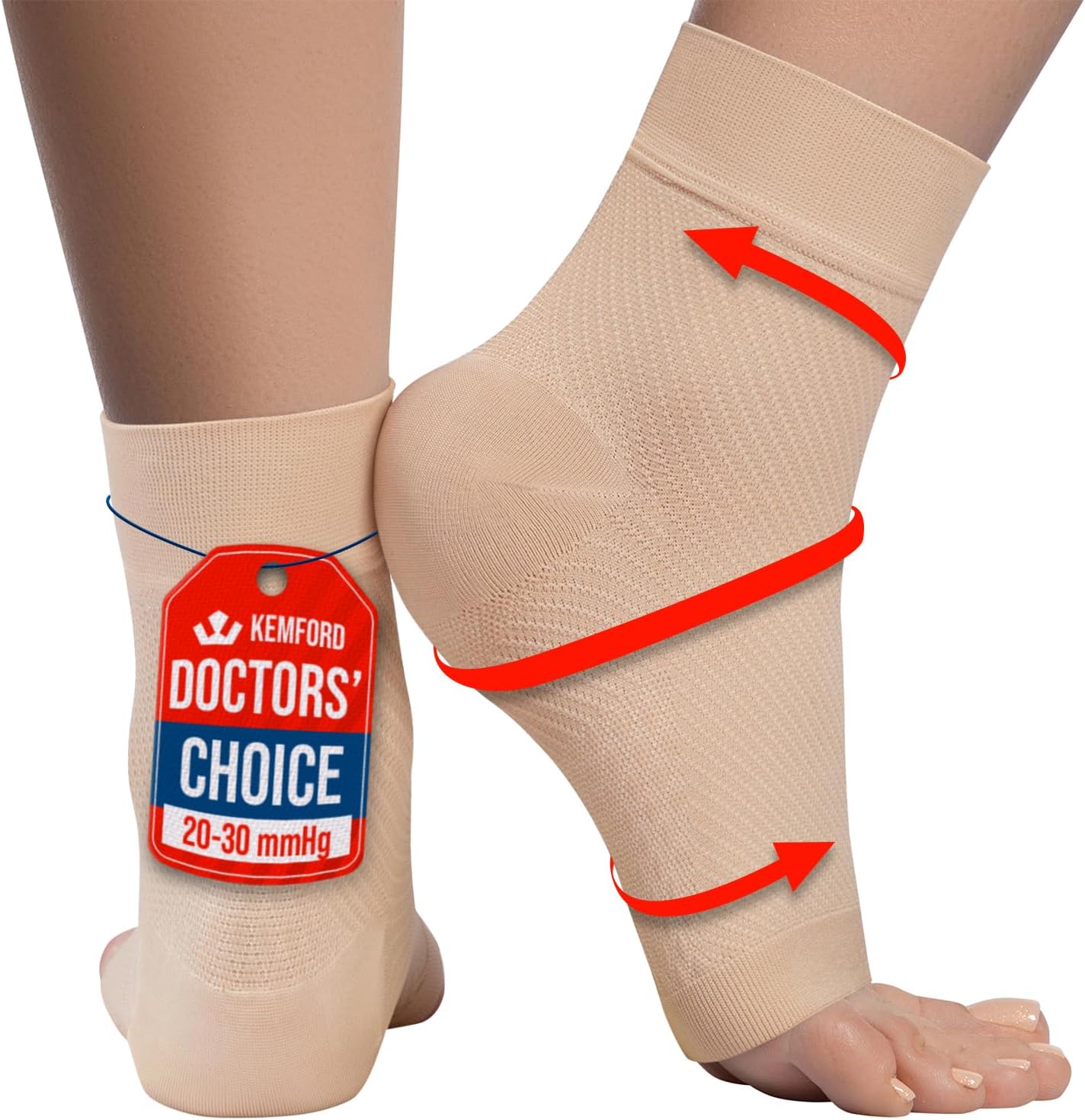 KEMFORD Ankle Compression Sleeve – Plantar Fasciitis Braces – Open Toe Compression Socks for Swelling, Sprain, Neuropathy, Foot Arch Support for Men and Women – 20-30mmhg, L, Beige
