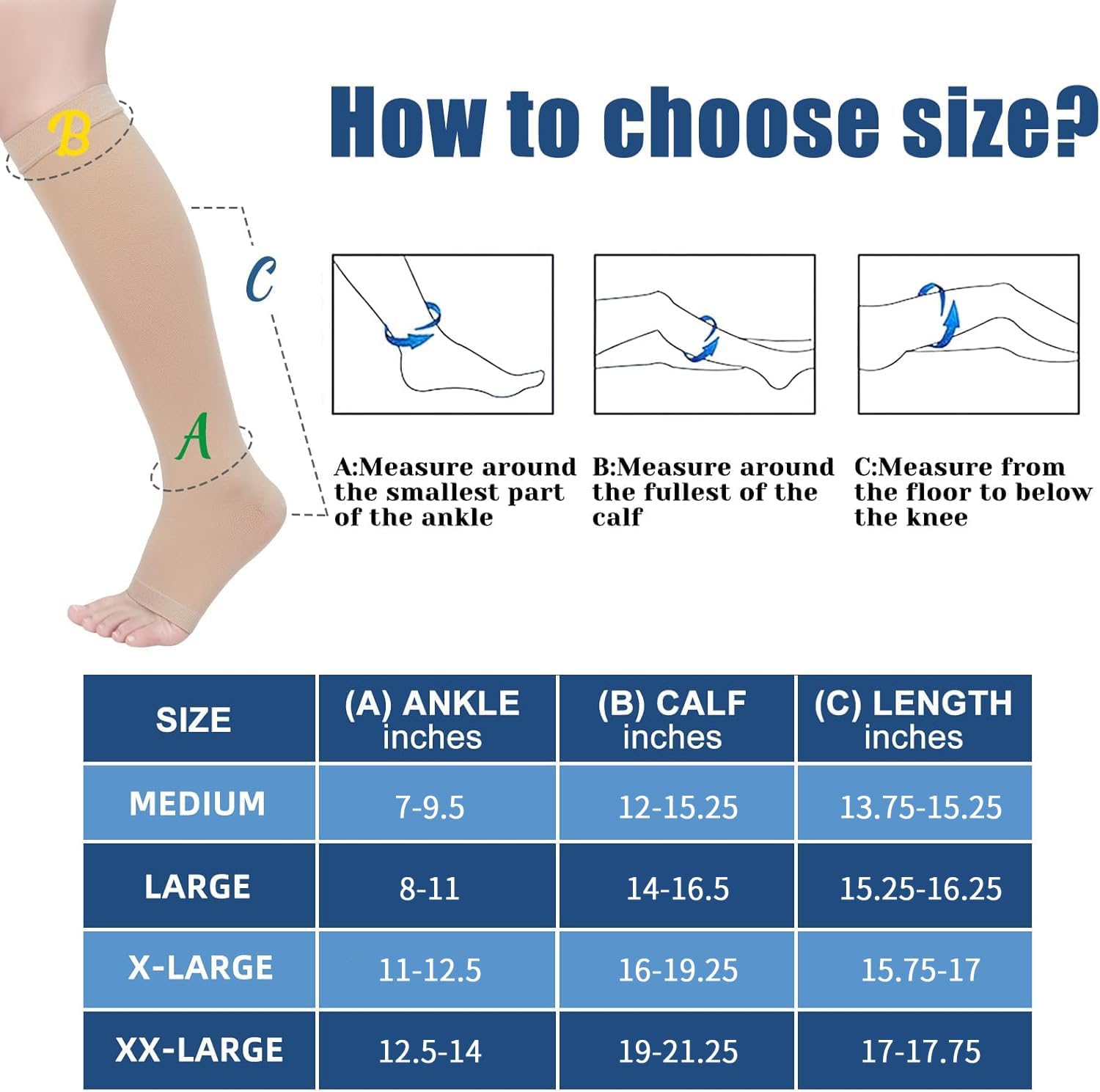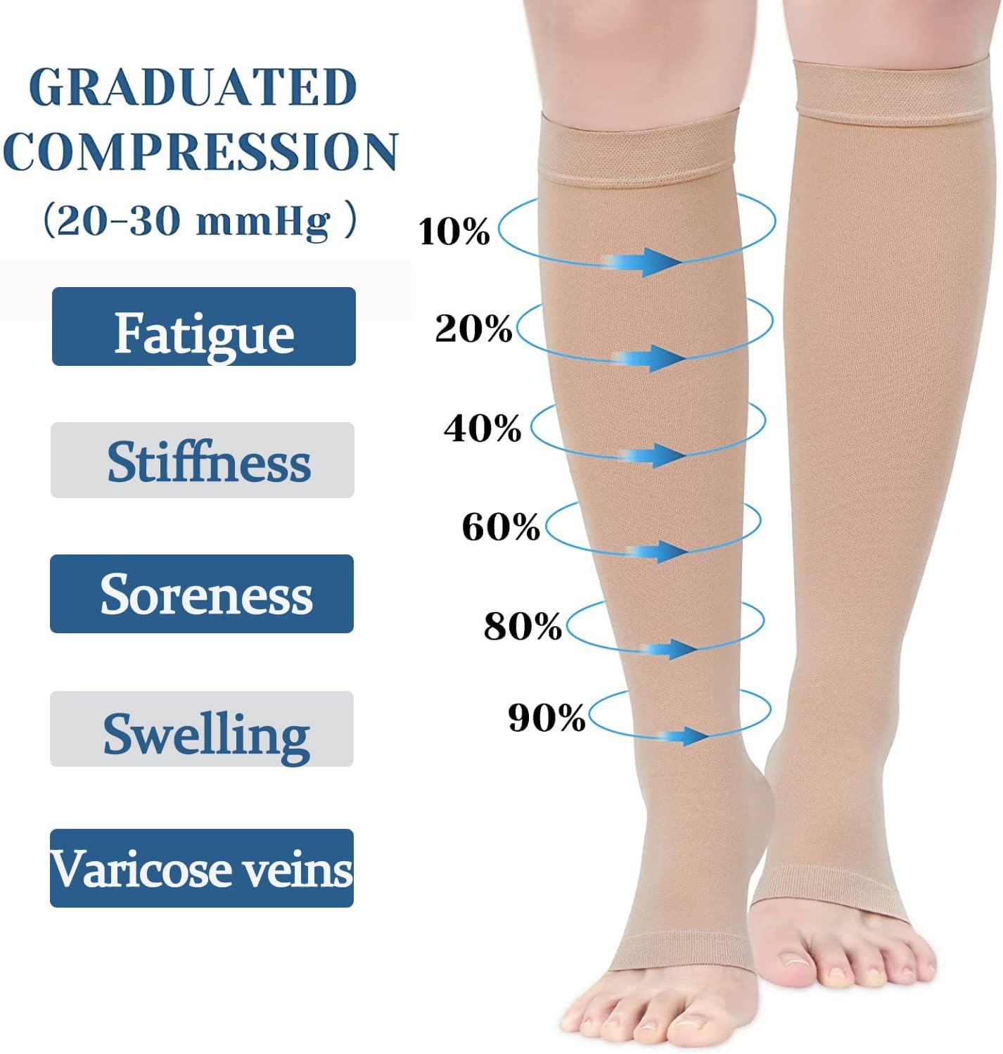 Instant Suport & RecoveryOur open toe compression stockings provide long-lasting support that relieves ankle swelling, leg cramps and foot fatigue. Helps reduce the risk of exercise injuries, varicose veins, edema, muscle pains, blood clots and more. Also great for post-surgery, shin splints or swelling issues recovery.