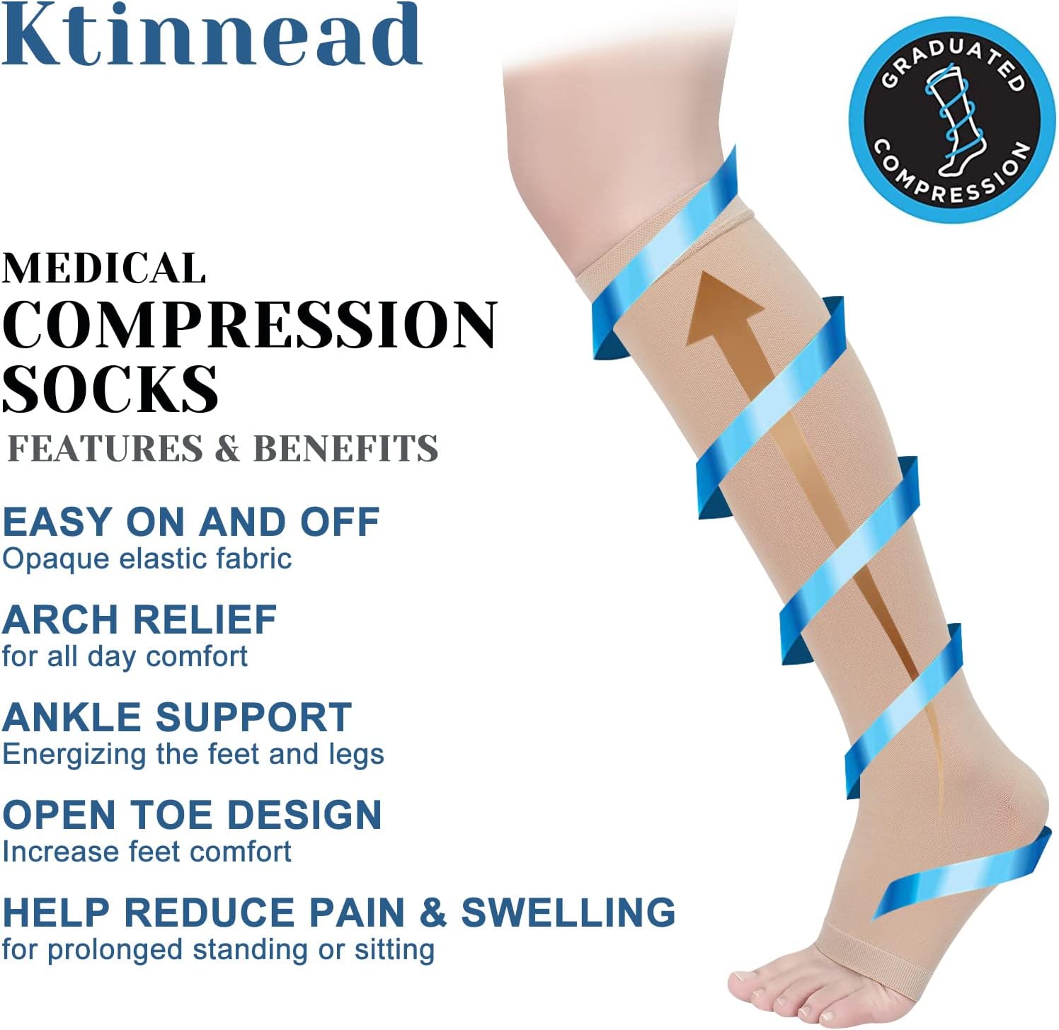 Graduated Compression: Ktinnead Compression Socks are designed to apply 20-30 mmHg of compression that creates the highest support pressure at the ankle and gradually decreases along the legs. Promotes blood flow and improves circulation, helping you with relief and improvement in your legs, ankles and feet.