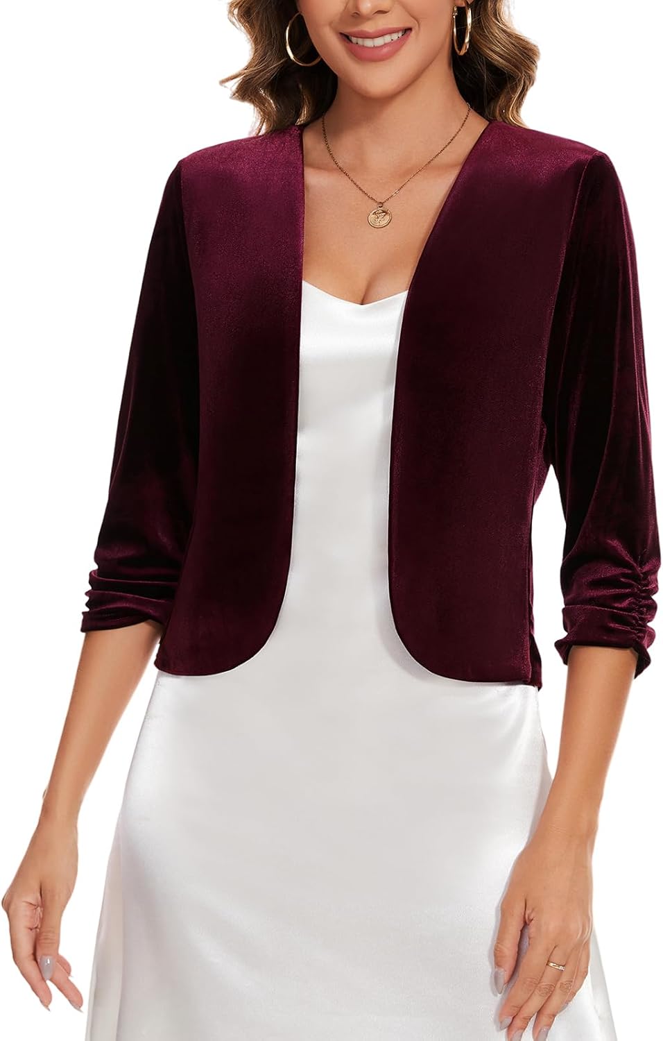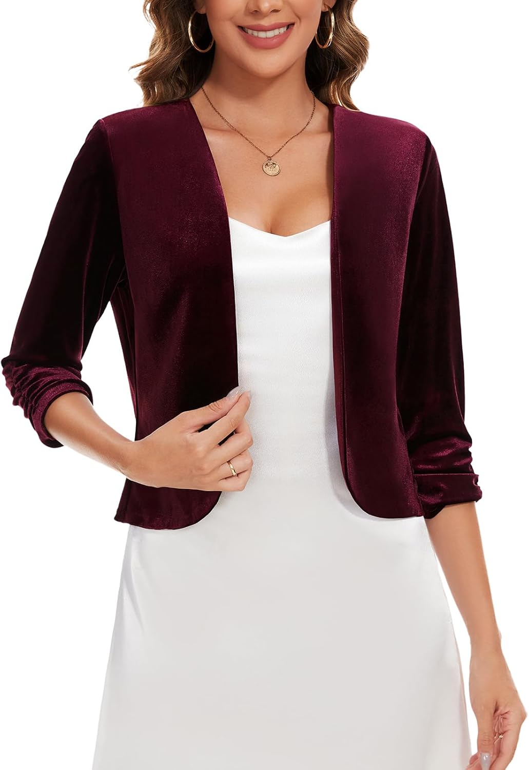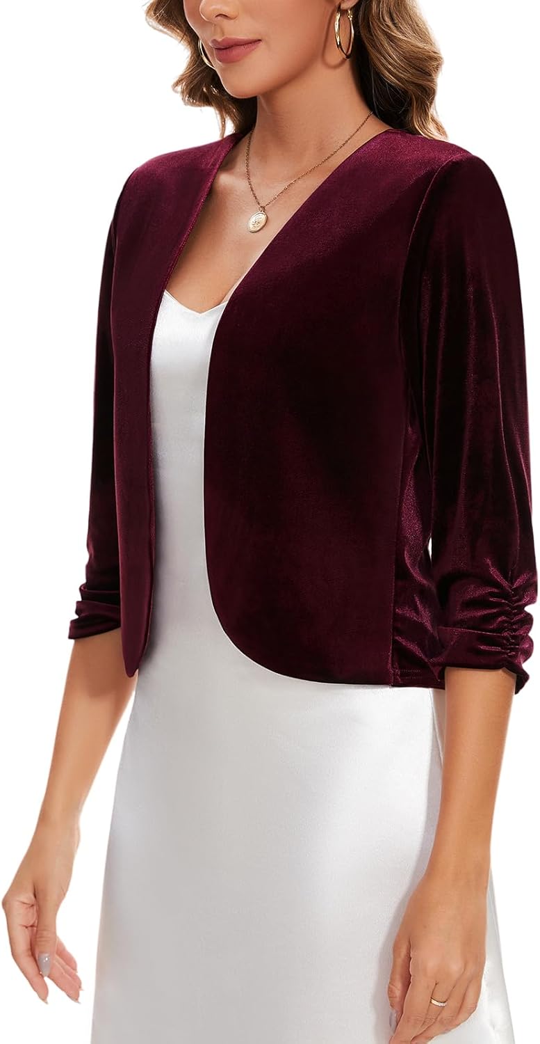 MINTLIMIT Velvet Blazers for Women 3/4 Ruched Sleeve Open Front Casual Work Office Cropped Cardigan Suit Jacket