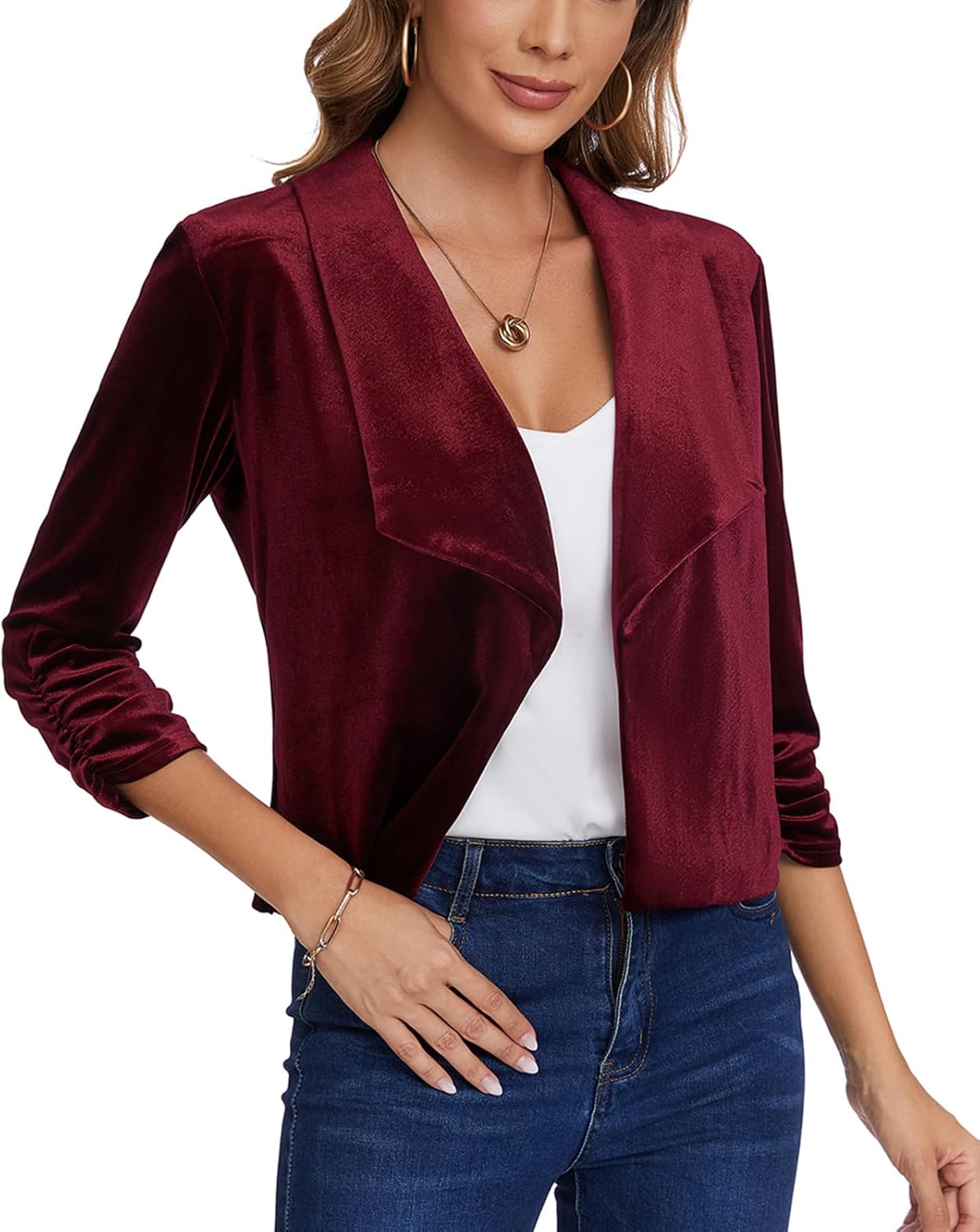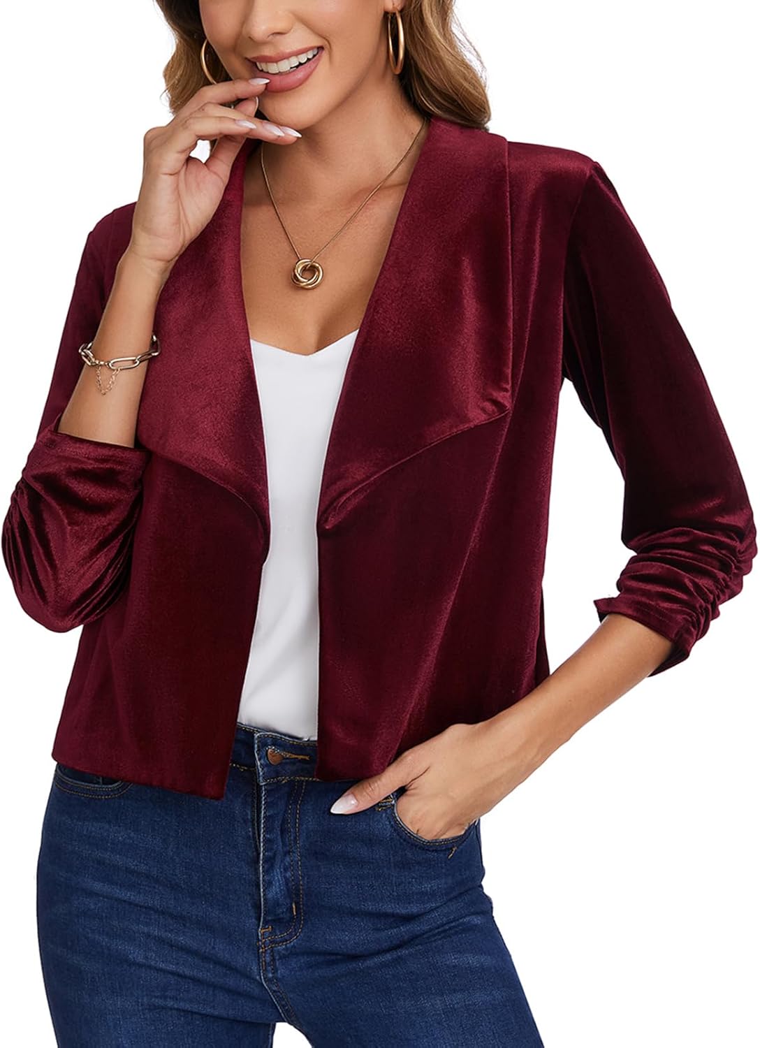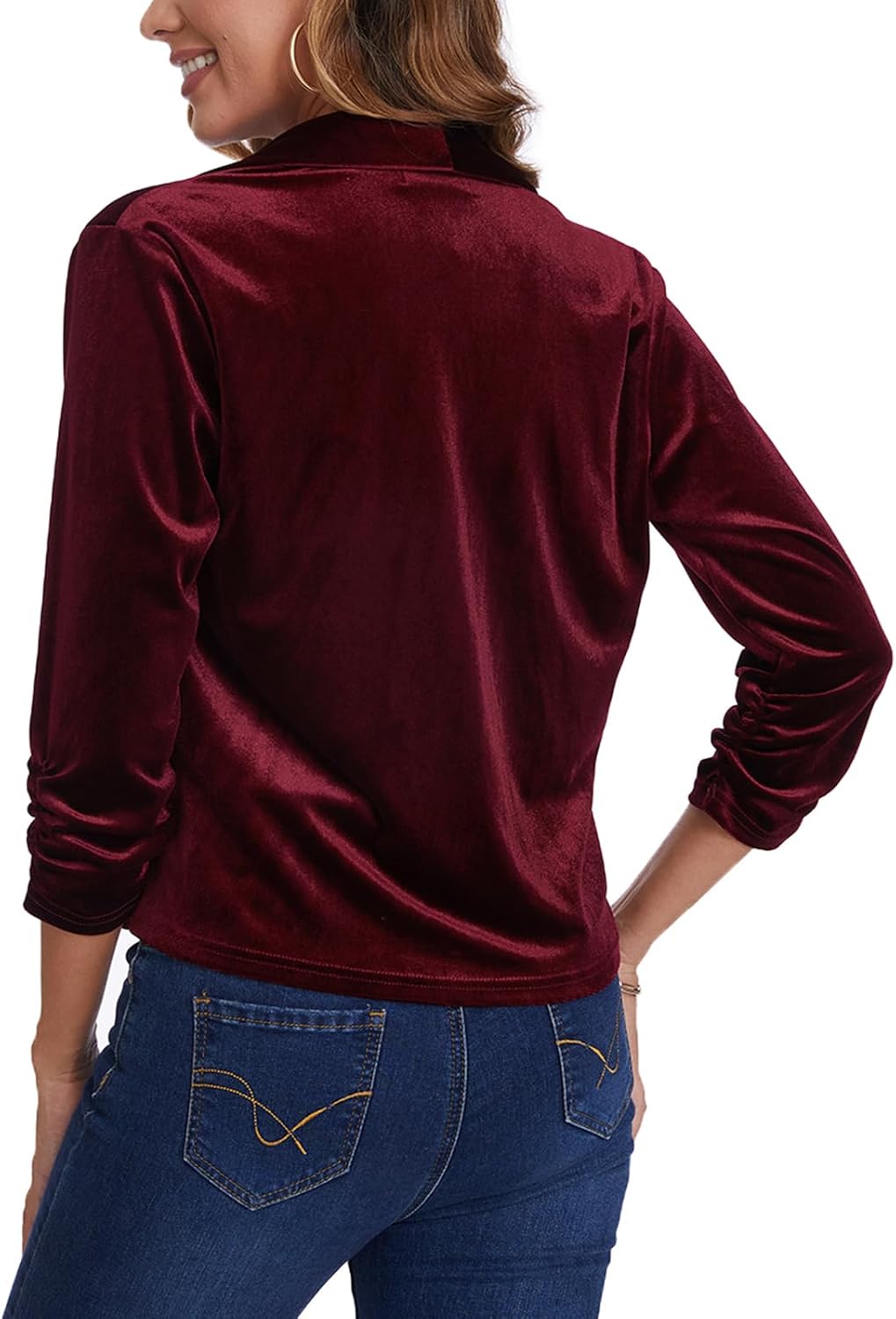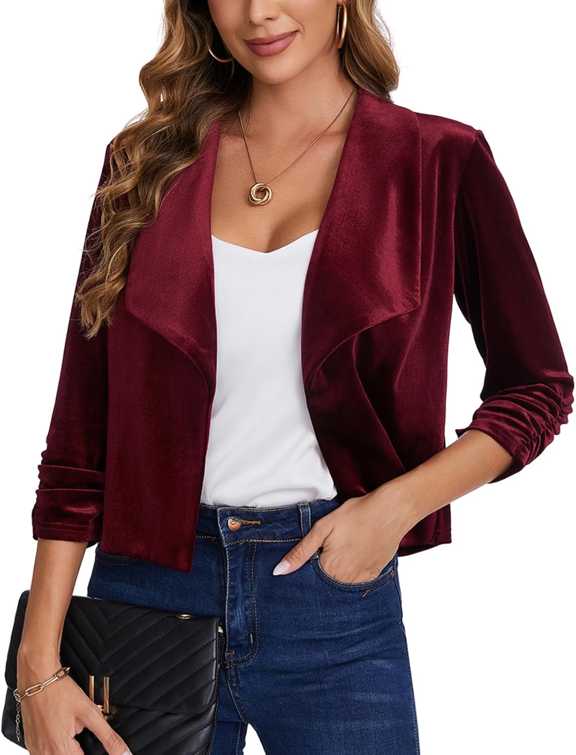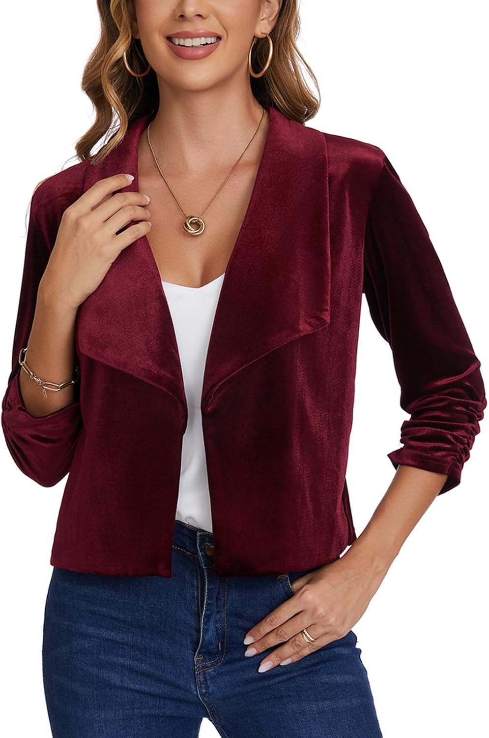 MINTLIMIT Women’s Casual Velvet Blazer Jackets 3/4 Ruched Sleeve Shawl Collar Draped Open Front Spring Short Velvet Blazers