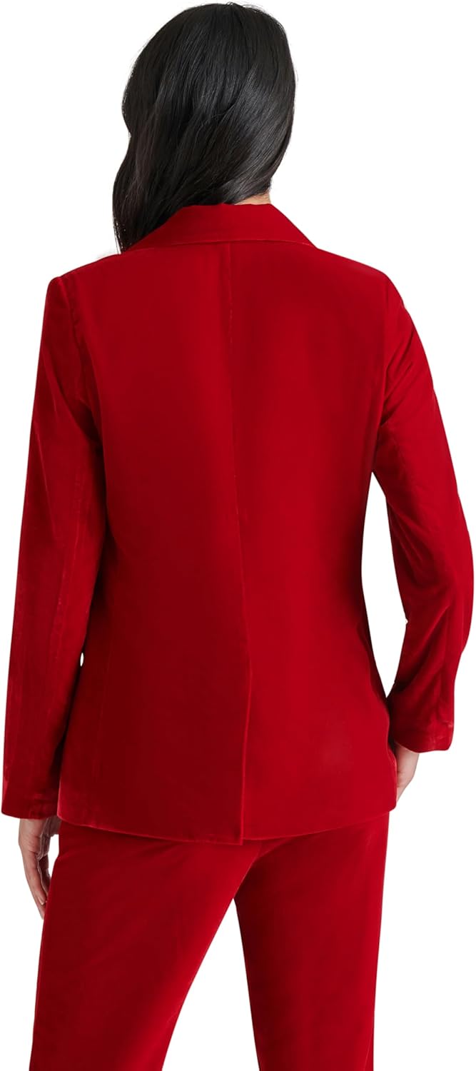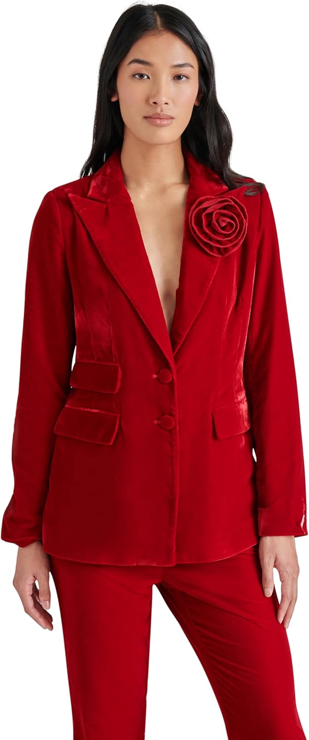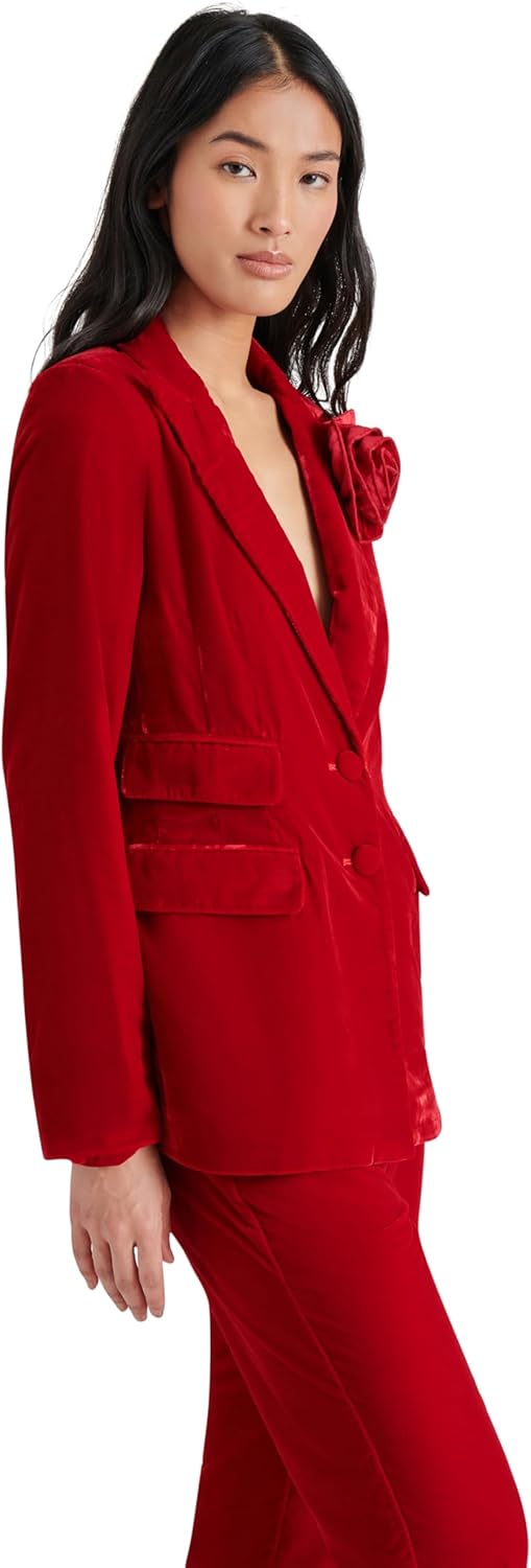 Single breasted blazer in velvet with rosette pin.