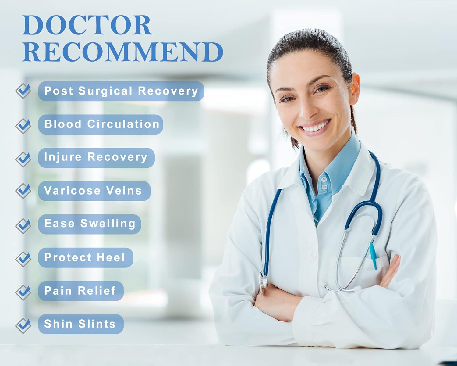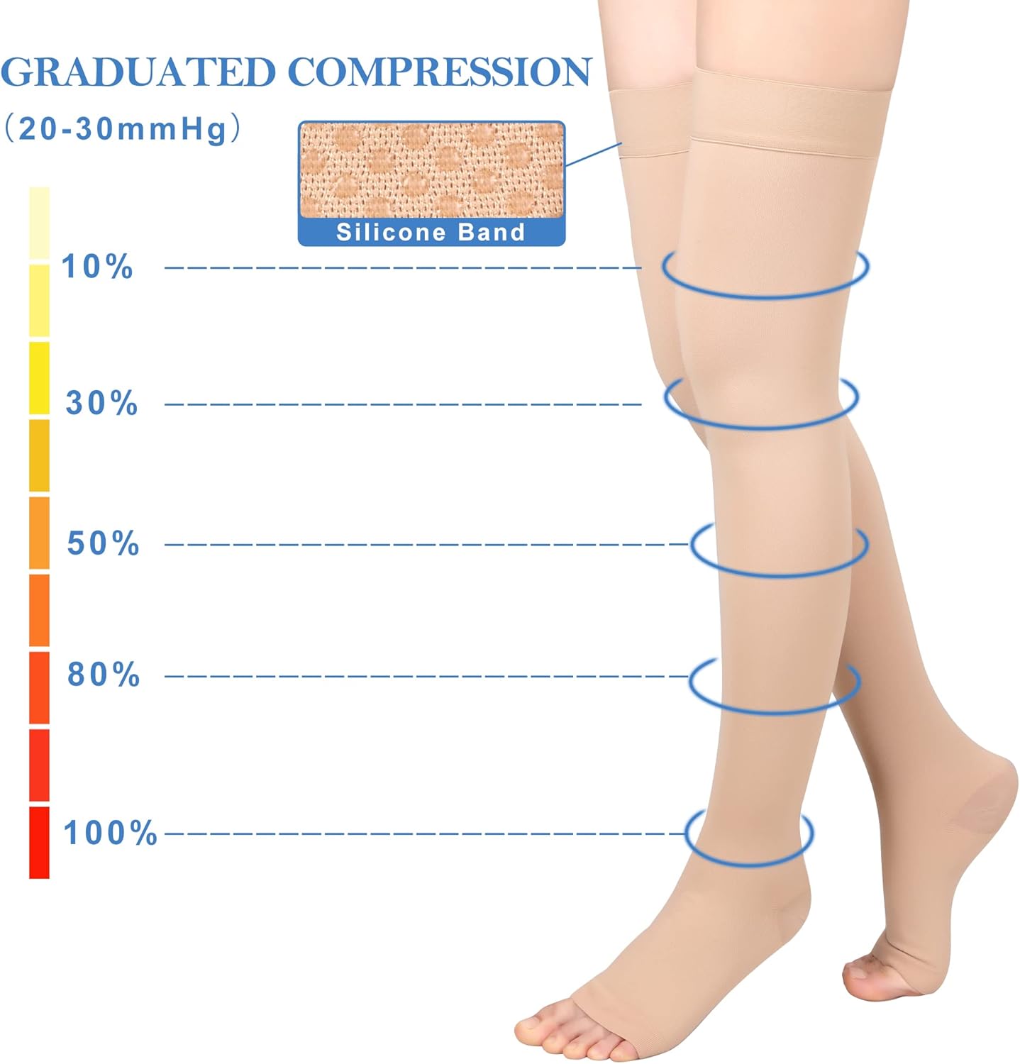 【EFFECTIVE THERAPY】Medical thigh high compression socks have been shown to help decrease post surgery swelling and pain in the legs and ankles. Increased circulation decreases swelling and increases blood flow, this reduces the feeling of heavy and achy legs. Helps relieve varicose veins, spider veins, sore aching muscles, edema, DVT blood clots.