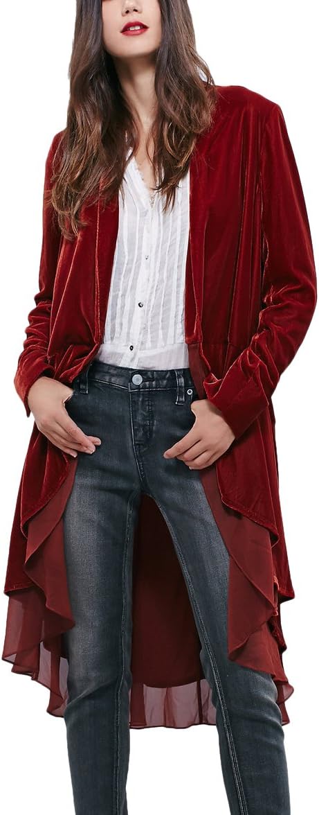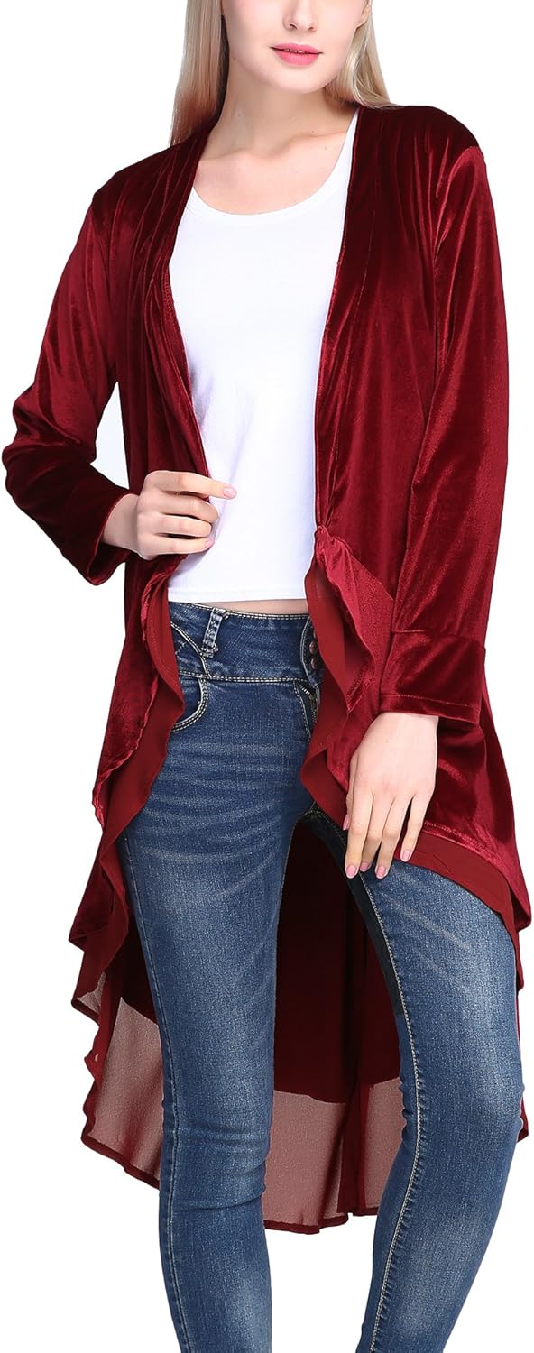 Urban CoCo Women’s Long Sleeve Velvet Cardigan Coat with Asymmetric Chiffon Hem